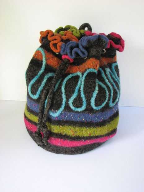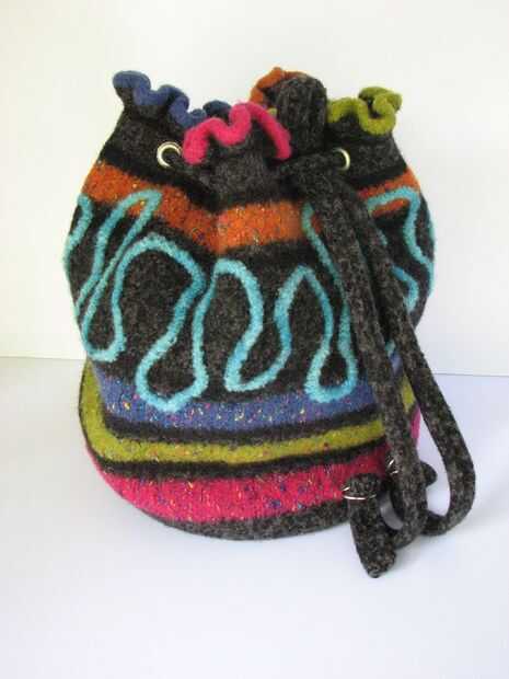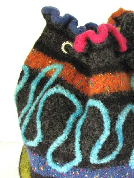 este gran tamaño y amplio bolso fieltro es perfecto todo un fin de semana bolsa de viaje o día. Bolso de lazo cuenta con ojales, top acabado con volantes y un conveniente correas del hombro. La bolsa es a mano tejidas con lana de marca León y adornado con trozos de la caja de desechos. Como un tejedor principiante, este diseño fue inspirado en colores brillantes y muy básicos conocimientos de tejer.