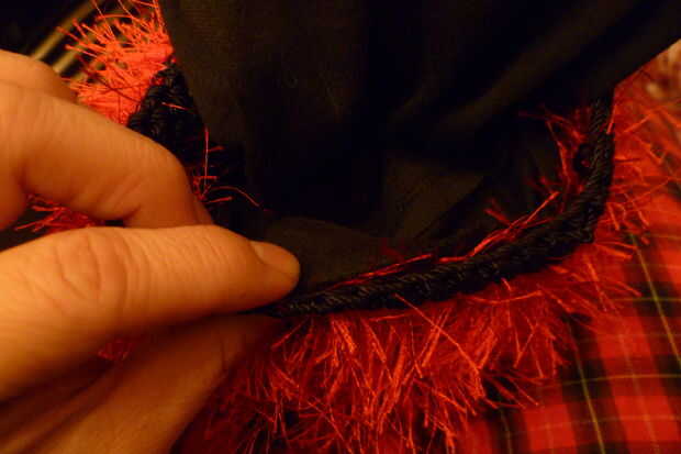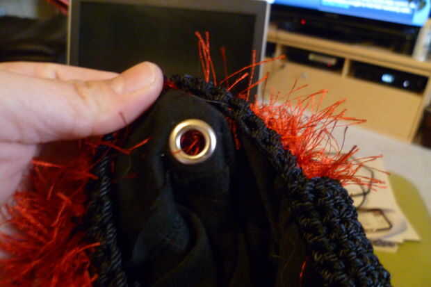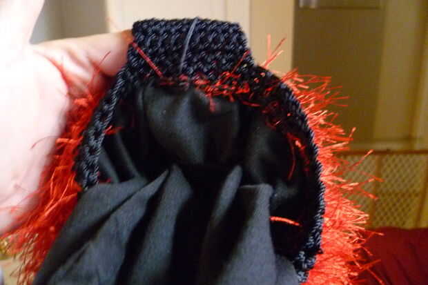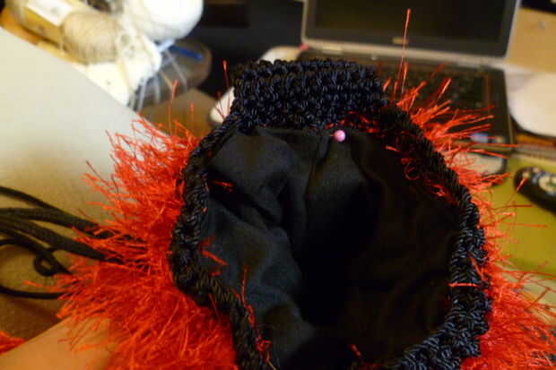 Pase una cuerda por el orificio de la bolsa y alrededor de la bolsa y recortar el exceso. Doble el forro interior del bolso y coser la bolsa difusa (que cubren la médula). Al coser, asegúrese de que coser no accidentalmente el cable.