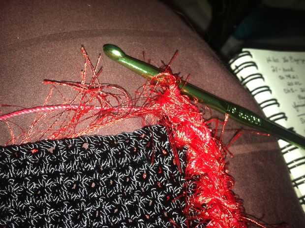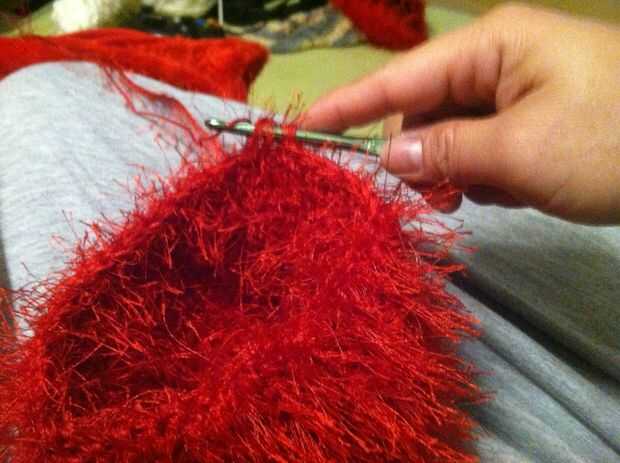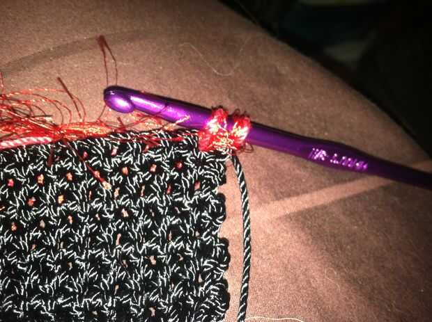 Resbalón de la puntada la combinación de hilados (piel + RFCT) al principio del hilo de nylon. Cadena uno y SC en la primera SC del hilo nylon.