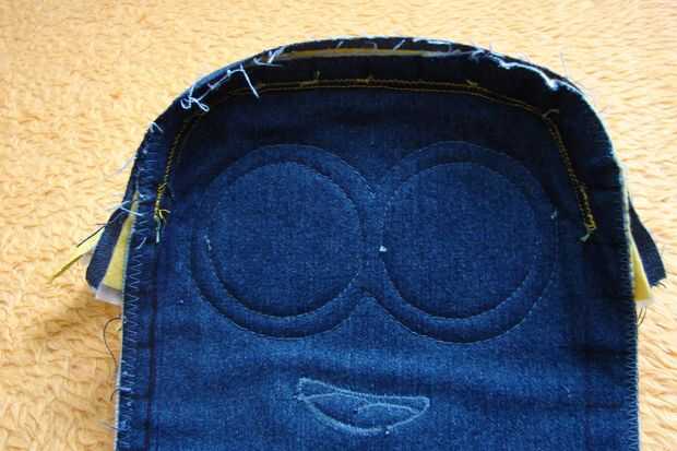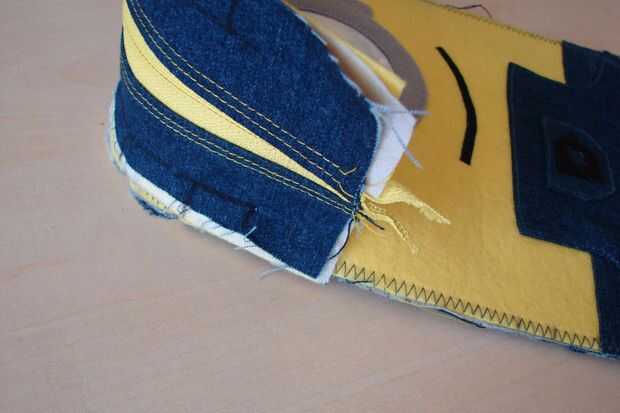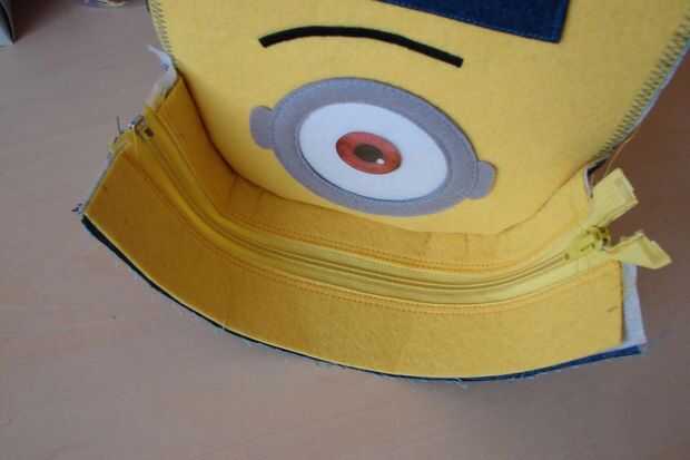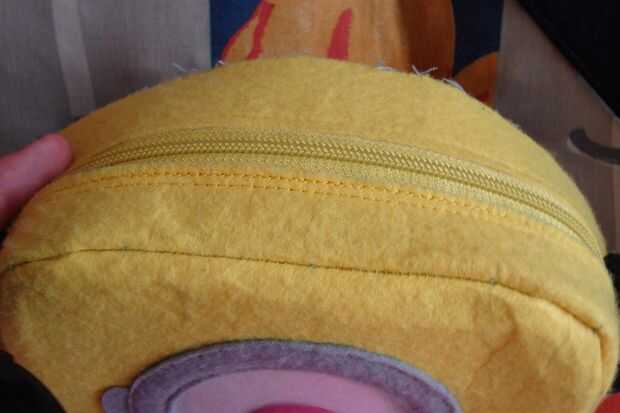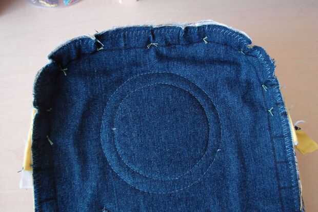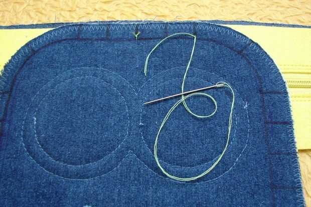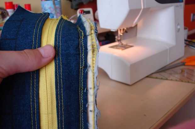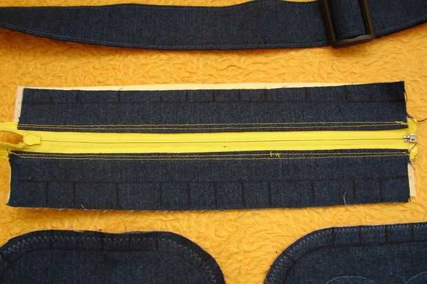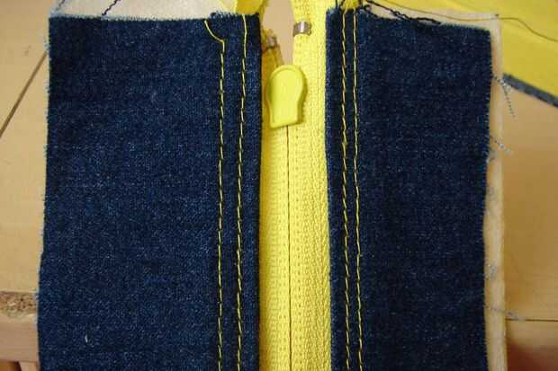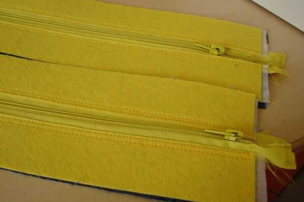 Coser piezas amarillo en zip, luego agregue del dril de algodón. Hilo verde es temporal. Sólo para mantener juntos mientras cose. Las líneas de marcador son los mismas que en el diseño. Ancho final de la parte superior (visible después de la costura) es de 6 cm.