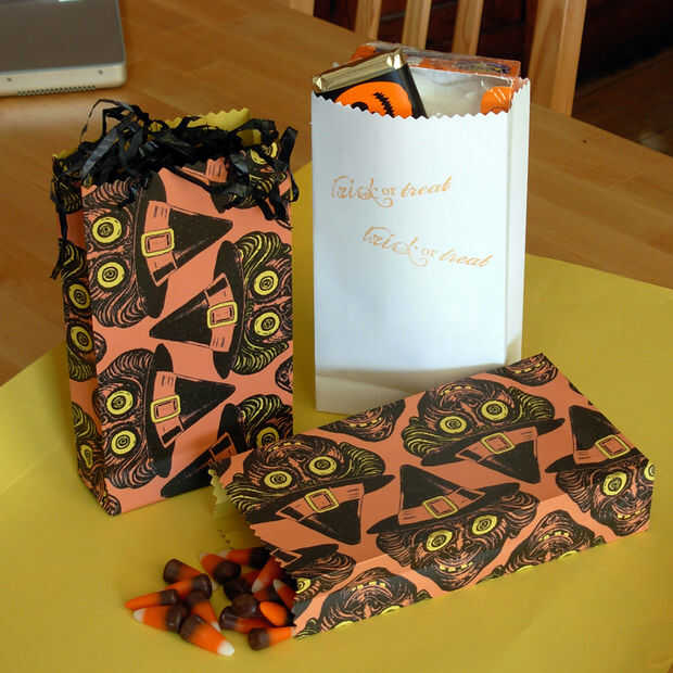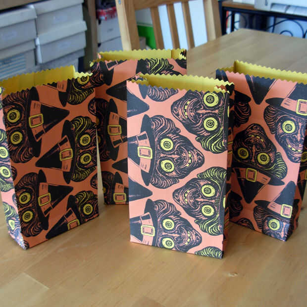 Usted puede hacer estas bolsas de papeles que tienes. He utilizado todo tipo de documentos incluyendo páginas de libro viejo. Llenarlas con dulces. Tal vez los embalamos con hierba de Halloween hechas en casa. Decorar con sellos o etiquetas engomadas.