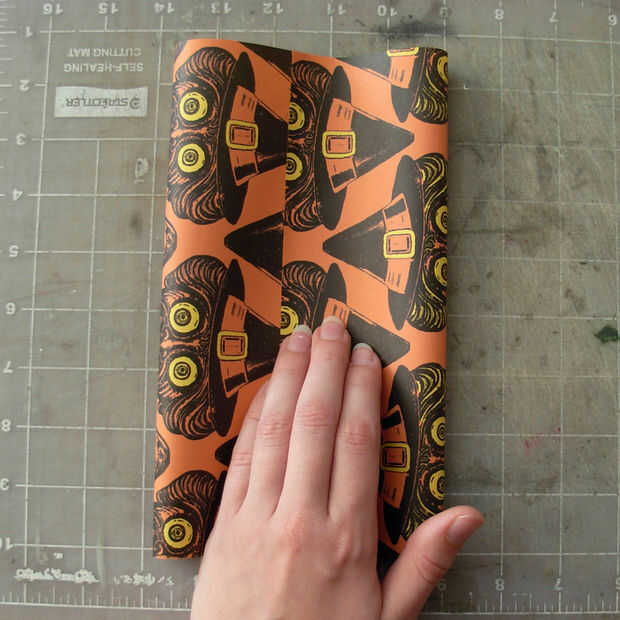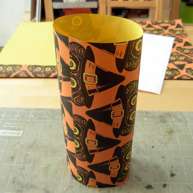 Sin arrugar los bordes, el rodillo los bordes de su papel hacia los demás. Alinee el borde pegado con las marcas de hash y doblada línea de borde inferior. Correr el dedo hacia abajo los bordes para asegurar la cola. Ahora debe tener un cilindro con la cara del papel en el exterior {foto 2}.