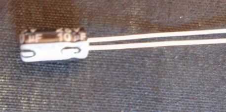 • Siguiente el condensador electrolítico de 10uf que debe ir de la manera correcta, la banda blanca es el cable negativo. Cabe en el PCB que se denomina C1