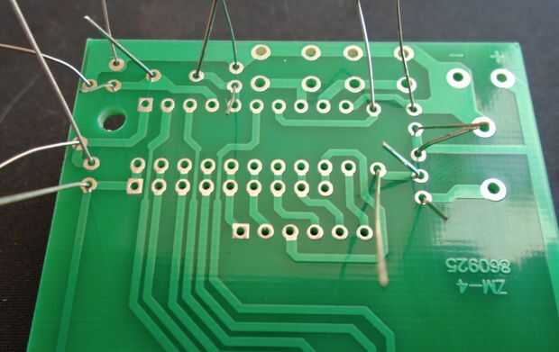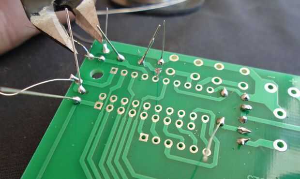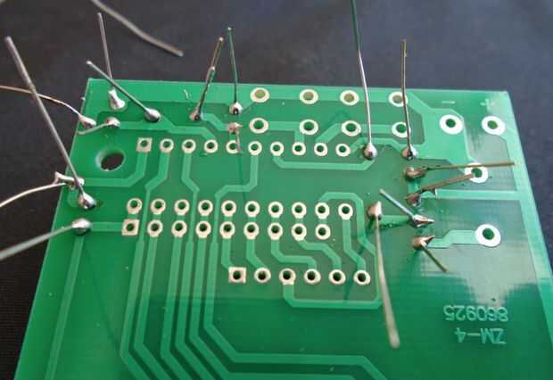 Ahora cuidadosamente usted puede soldar los cables en la parte posterior del PCB. una vez soldado los cables se pueden cortar con un fuerte conjunto de cortadores.