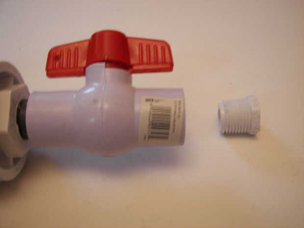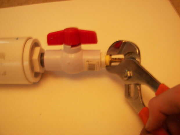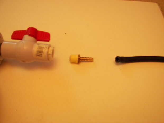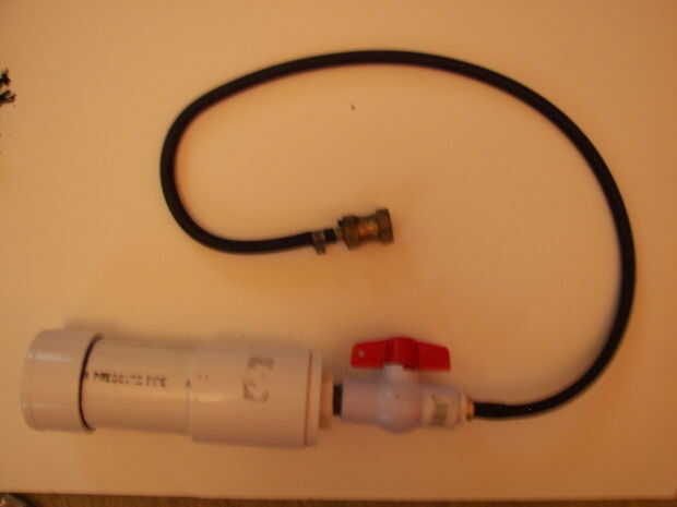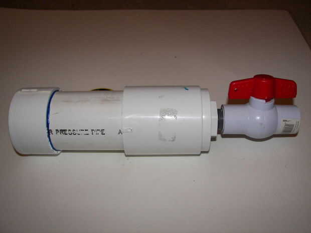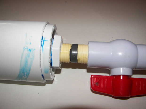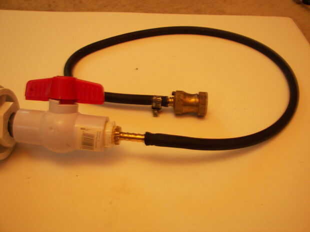 por este tiempo el pegamento será seco. Utilice alguna cinta de teflón para enroscar la válvula de bola 1/2 pulgada. Atornille el PVC 1/2" a 1/4". Utilice cinta más para tornillo de 1/4" a la lengüeta de la manguera. Presione la lengüeta de la manguera en un tubo con una válvula presta hembra en el otro extremo. Esta válvula se puede poner en una válvula presta y tubos de la bomba.