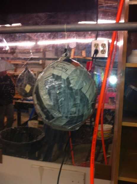 a seguir cubrir el globo en tiras de papel maché.  Asegúrese de que el globo se seque completamente entre capa y capa.  4-5 capas de periódico son óptimas.  Dejó el periódico completamente seco antes de continuar al paso 5.