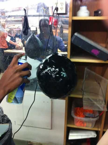 Funcionará cualquier pintura en aerosol negro.   Tomar alguna pintura en aerosol y rocíe sobre la bomba con la que hace agradable y oscuro.  Dos o tres capas de pintura será óptimas.  (Observe cómo nuestra bomba es apoyado por el alambre.  Colocamos el alambre como en el paso 7 en lugar de utilizar la cadena ya allí) permite la pintura completamente seca antes de pasar.