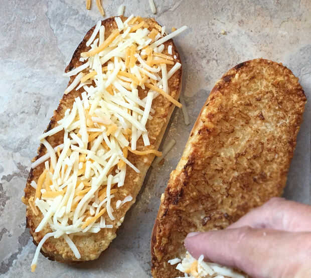 Esparcir queso rallado uniformemente a través del pan para presentar una superficie plana y al ayudante en el proceso de fusión.