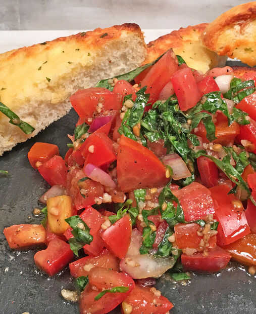 porque vivo en una familia italiana, disfruto muchos alimentos italianos como pizza, espaguetis y albóndigas y cosas como bruschetta.  Esta es una de las recetas de brushetta favorito de mi mamá que ella hace a menudo, y es un gran snack o aperitivo