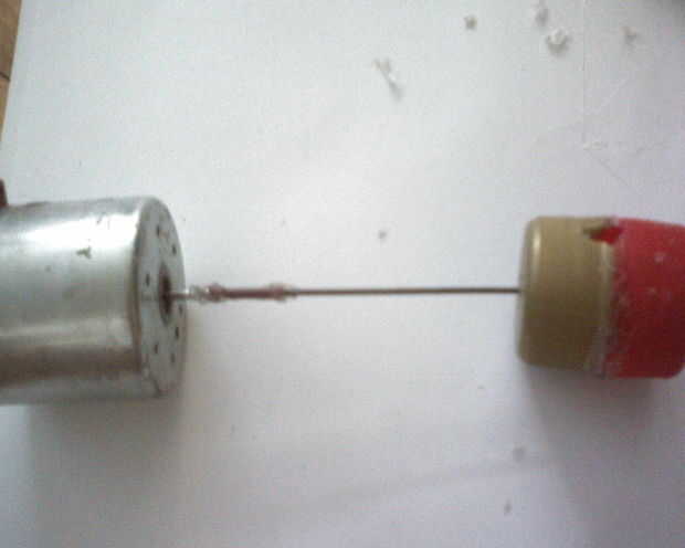 Obtener un pequeño pedazo de aislamiento del cable (aprox 3-4mm), con diámetro de adecuada y ponerlo en el eje del motor, luego poner en el otro extremo del eje de la hélice. Ahora ponemos un poco de pegamento caliente en los extremos del aislamiento para pegar a los ejes.