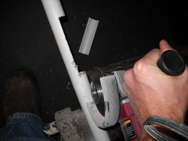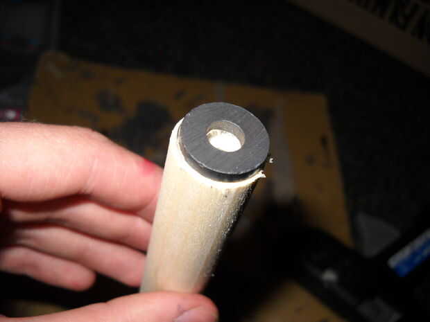 -Cortar una pieza de 11 pulgadas de pasador y una pulgada de 1/2 pieza de tubo de PVC de 1". Pegue el anillo largo 1/2 pulgada en un extremo de la espiga. Trate de mantener la clavija de centrado en el ring como el pegamento se endurece. Pegue un imán de cerámica que es aproximadamente el mismo tamaño que la espiga en el otro extremo de la espiga.