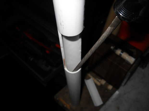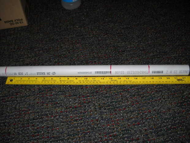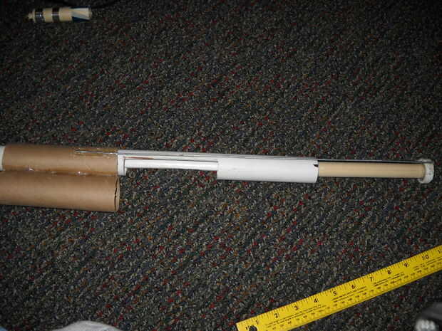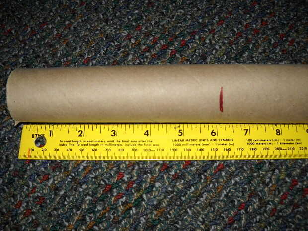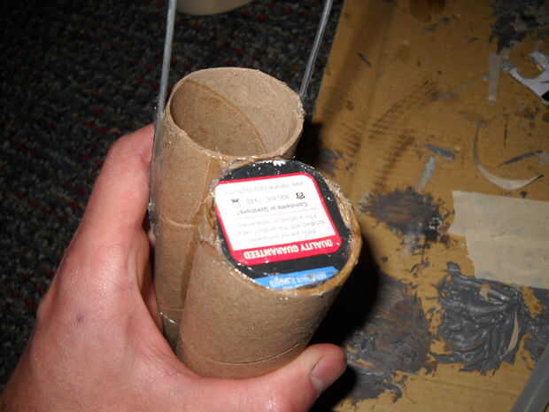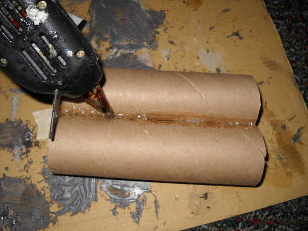 -Corte los trozos de dos 6 pulgadas de un tubo de cartón que se coloca sobre el tubo de PVC de 1". Los ponen paralelos uno al otro y pegar juntos. Pegar tapas de cartulina en los extremos de uno de ellos.