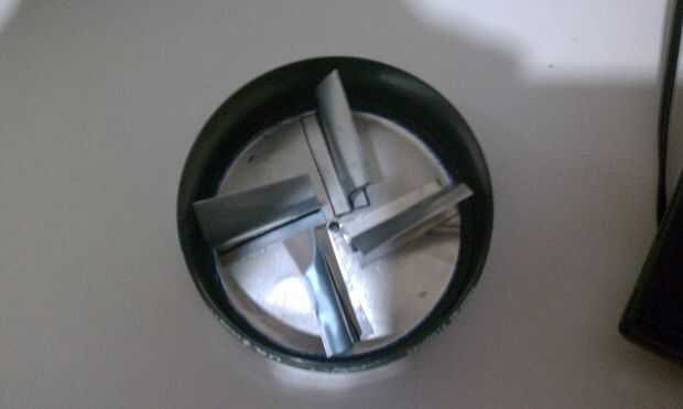 Con la hoja de aluminio restantes, utilizando las tijeras y la regla, medir y cortar 4 tiras de 50 mm largo por 25mm de ancho para hacer las aspas del impulsor.