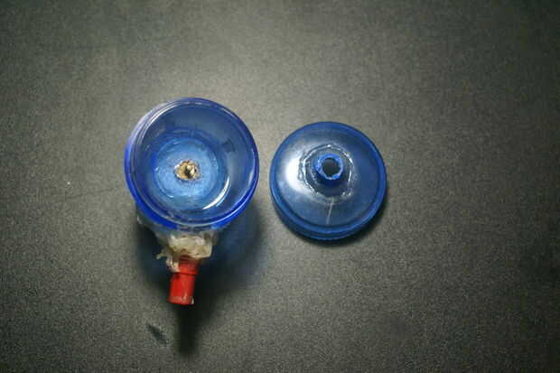 Ahora pegue los componentes en sus respectivas perforaciones, asegurándose de que son agua firmemente y sellado en su lugar. Una vez más, tenga cuidado de no pegar cierre el frasco.