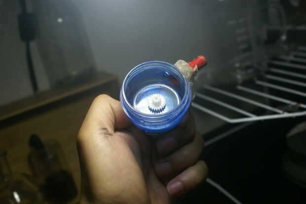 -Encolar cuidadosamente el ventilador sobre el eje del motor. No desea que la marcha para pegar en el frasco de viaje... no gira.