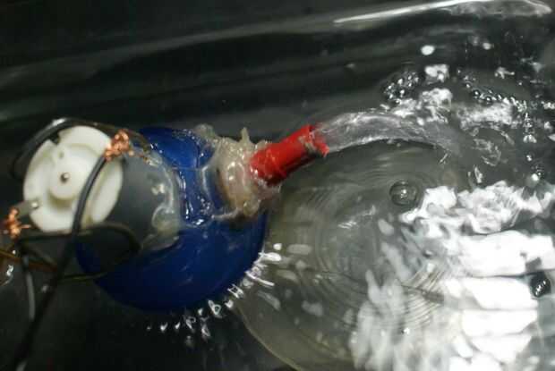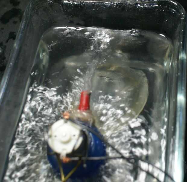 Si el ventilador más bien débil, intente aflojar un poco el ventilador del eje. Si eso no funciona, utilice una tensión ligeramente superior. Para probar en el agua, la jarra debe estar cerrada. Utilizar una abrazadera o las manos para sujetar la bomba en la superficie del agua, teniendo cuidado de no dejar el motor submerge.
