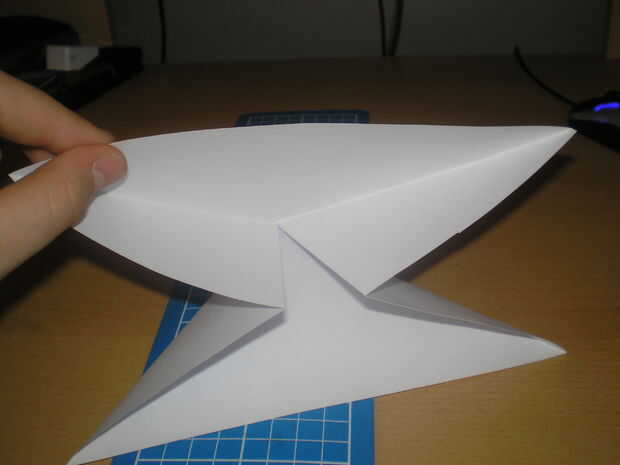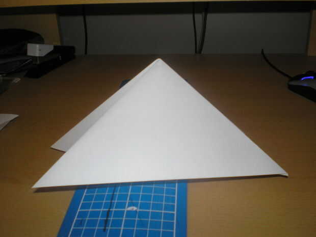 Ahora debe ver el papel, ha de triagles en él, debe empujar a los lados que están frente a cada otros hacia adentro, esto es similar mirando a un sombrero de papel si se hace correctamente.