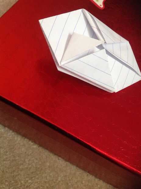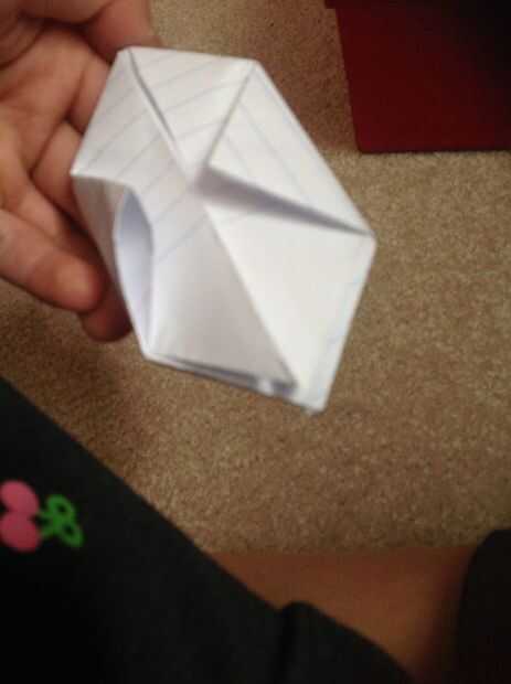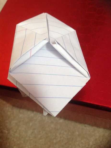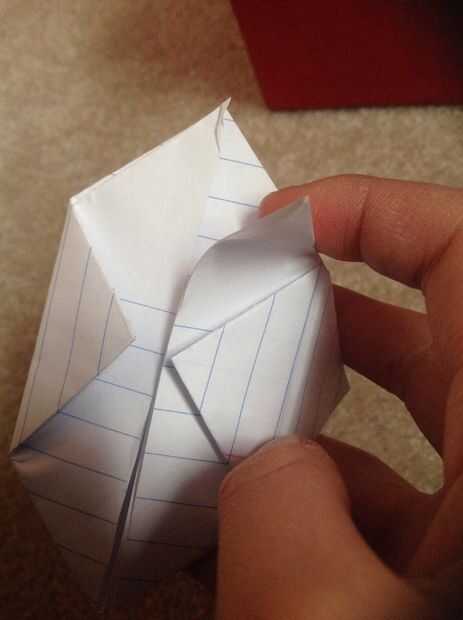Primero tomar los puntos superior y doble hacia abajo, luego tomar las solapas superiores puntiagudas y meta en los bolsillos del triángulo. Hacerlo en ambos lados