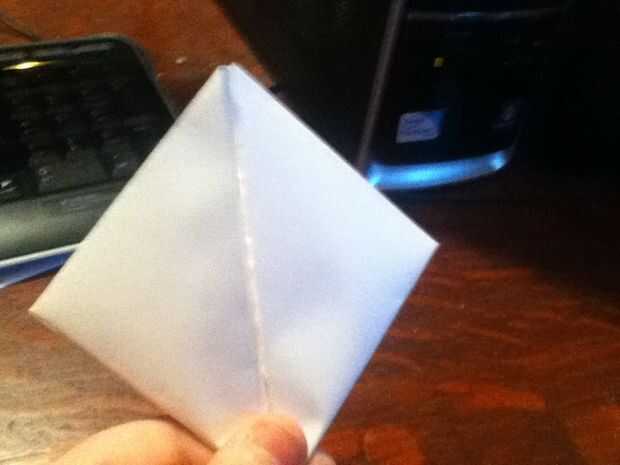 vamos a hacer una bomba de papel!Fuentes:Hoja de papel cuadradaPaso 1: doblar Plegar la parte inferior para crear un triángulo.Desplegarlo y hacer lo mismo para las otras esquinas, ábrala otra vez y verás una x en el medio.Luego doblar por la mitad.P