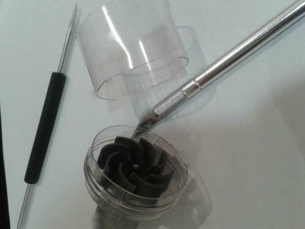 Lo que hice fue reducir el tamaño de envase transparente justo por encima de la hoja con un cuchillo de la manía. Esto es paso muy importante, como ya he mencionado, al igual que el paso antes de que tiene que ser muy exacto y ajustado. Tirantez y la precisión son clave para que la bomba funciona bien.