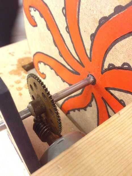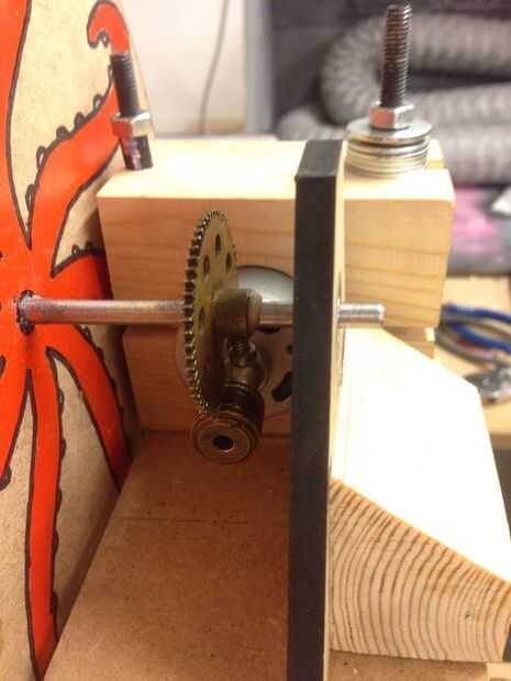Se utilizó una impulsión del gusano en el eje del motor, sólo encontramos uno bien los armarios y martillado en apretado. Esto era de plástico, y así eran nuestros engranajes. Al final esto sólo comió sí mismo bajo la fuerza y consiguió real puré para arriba. Nos fija en el extremo, mediante el uso de engranajes del metal Mecano, si tienes algunos de los que utilizan. Probablemente puede comprar barato de una ferretería local o algo así como pequeños engranajes.