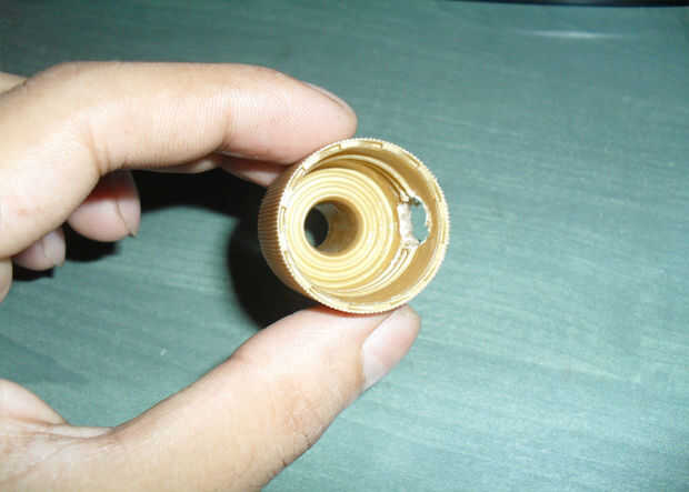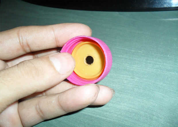 primero de todo necesitamos dos tapa botella de fo. Recuerde 1 cap debe ser pequeño y 2 º el tapón. oye yo uso 1 tapa de botella de agua y 2 º es de cap.but de relleno de mosquito también puede utilizar el tapón de la botella. ahora hacer un agujero en la tapa 2. agua proviene oír. Haga un segundo agujero en el lado de la tapa. agua sale de oír.