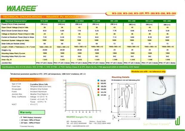 Especificaciones detalladas de los paneles solares se dan en la hoja de datos de panel solar.