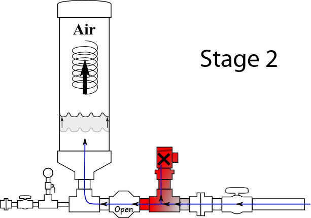 Comienza el ciclo de la bomba, flujos de agua abajo el tubo y hasta por el swing válvula de retención. Agua comience a fluir más rápido alrededor de la aleta de la válvula de retención, hasta que la fricción extrae la aleta de arriba, cerrarse de golpe cerrado. Esto causa un aumento de la presión en el cuerpo de la bomba, como el agua que fluye por el tubo a cierta velocidad ya no tiene lugar para ir. Esta presión es relevada por el agua que fluye a través de la válvula de retención de resorte, más hacia el lado de la cámara de presión de la bomba. Una vez más allá de la válvula de cheque de oscilación, no puede volver y debe permanecer allí. Cuando la diferencia de presión a través de la primavera ver gotas de válvula, la válvula se cierra y agua dejará de fluir a través de él. La baja presión permite las válvulas de retención abrir de nuevo, comenzando el ciclo de nuevo.