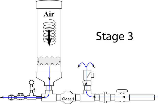 A veces el agua fluirá de la válvula de cheque de oscilación, entonces la válvula se cerrarse de golpe cerrada, pero no pasa nada. Si esto ocurre, presione la aleta de la válvula a abrirse otra vez y que el ciclo comience otra vez. En teoría estas bombas necesitan cierta contrapresión (viniendo desde el lado del tanque de presión) para operar, pero nunca he tenido ningún problema conseguir mina va con unos golpecitos básica y trasteo.