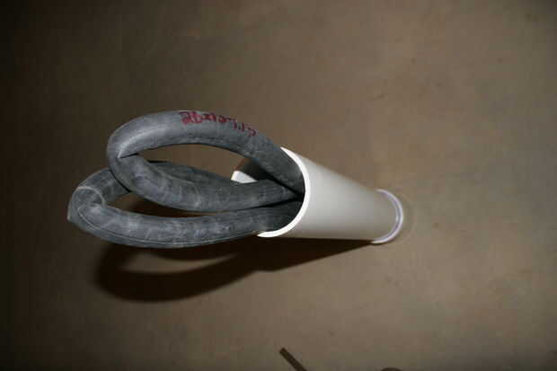 El tubo de la bicicleta evita que la cámara de presión ser anegados durante la operación. Aire se disuelve en agua. Lo hace así más fácilmente a alta presión. (Esto está relacionado con cómo comercialmente son carbonatadas refrescos producidos) El tubo de la bicicleta secuestra parte del aire entre nunca en contacto con el agua (en teoría) e impide toda del aire llevan fuera de la cámara de presión.