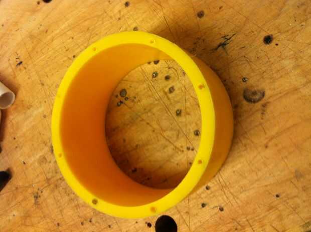 Cortar 60mm desde una tubería grande. Perfore agujeros usando el anillo de sellado como guía. Los agujeros utilizando la inmersión del hilo de rosca. Asegúrese de que el dip y los pernos que se utiliza coincidan y que los agujeros son lo suficientemente profundos.