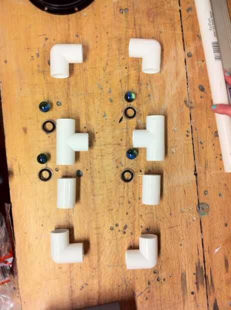 Corte dos anillos de 21,5 mm ancho y con un agujero de 12mm en el centro. Pegamento estupendo de una Junta Central en cada uno de los dos anillos. Este es el asiento de los mármoles y entrará en las articulaciones. El asiento se encuentra entre el labio del conjunto y el tubo de pvc, así que el cemento de pvc es todo el pegamento que se necesita. Para detener el mármol "escape" que necesitamos poner un clavo a través del tubo que está conectado con cada empalme de la válvula. Es importante que el clavo quede perpendicular y a través del centro, debe ser aproximadamente de un año y medio de diámetro mármol del asiento.
