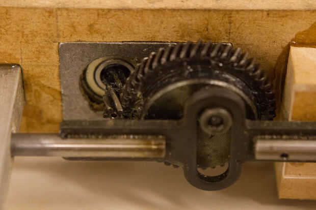 Un scotch mecanismo de yugo y engranaje fue tomado de una sierra de calar. Necesita ser adaptado para los diafragmas de conducir y ser conducido por el motor. Estos fueron soldadas con láser (no soldamos normalmente como la ventilación no estaba trabajando allí en el momento) sobre el yugo escocés como se muestra arriba.