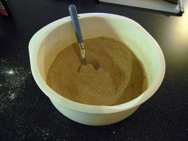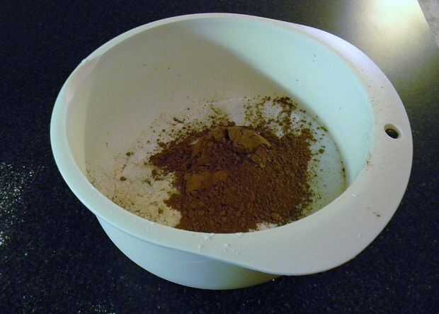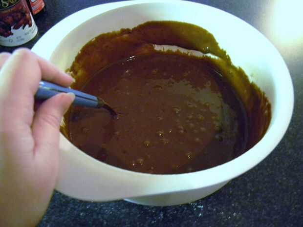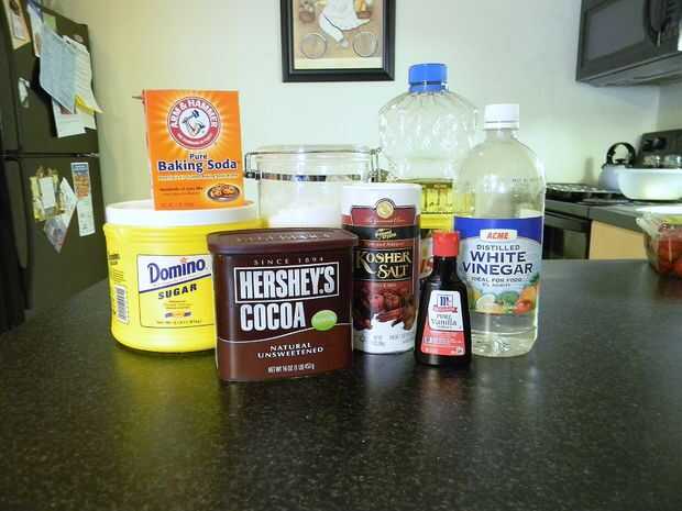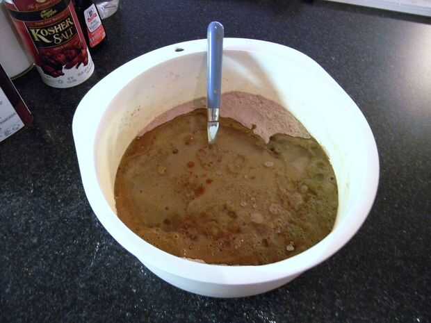 En un tazón grande, mezcle la harina, azúcar, cacao, sal y bicarbonato de sodio. Luego añadir el aceite, agua, vinagre y vainilla y remover hasta que se mezclan.