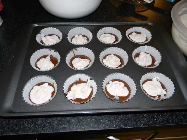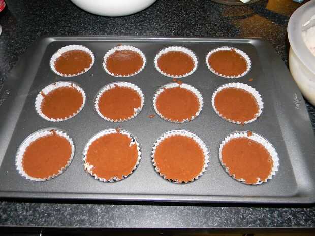En primer lugar, establezca su horno a 350 grados F (175 grados C). Entonces, salir bastantes moldes de muffin para 24 cupcakes de tamaño completo a la vez, o usted mismo entregue a hacerlo en lotes **. Poner forros de papel en la bandeja de muffins y luego rellenar cada porción entre 1/4 y 1/3 del camino de la Magdalena de la mezcla. A continuación, coloque una cuchara llena de la fresa de relleno en cada porción. Me gusta usar una cucharada llena, pero la cantidad depende de usted. Para acabar con la Magdalena, rematar cada porción con más mezcla de la Magdalena, por lo menos suficientes para cubrir el relleno. Hornear los cupcakes por aproximadamente 25 minutos ***. Una vez que se hacen los cupcakes, dejarlos reposar al menos 15 minutos que se enfríe.
