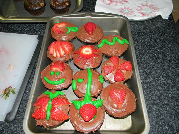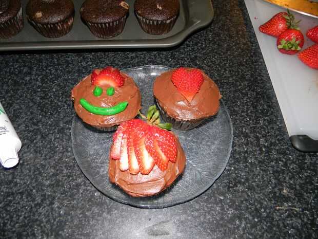 Helada los cupcakes con el glaseado y decorar como quieras. He utilizado el resto de la pinta de fresas junto con un tubo de glaseado verde de Betty Crocker.