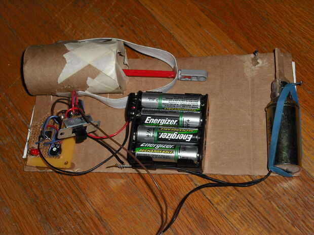 Antes de que podemos pasar a construir el mecanismo percutor, debemos montar lo que ya tenemos. Deje que la imagen sea su guía y usar un montón de pegamento caliente. También cabe señalar que la tabla es 9 por 4.5 pulgadas y doble layerd para el strenth. Mientras estás en ello, también debe montar solonoid, tal como se utiliza paso siguiente.