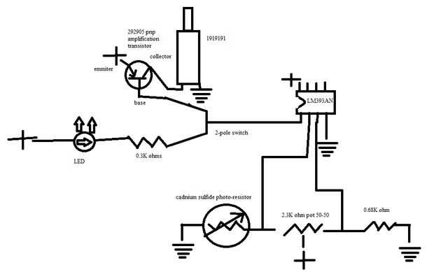 Cabe destacar si la fotorresistencia tiene una resistencia diferente que mina r1 tendrá que ser diferente. R1 debe estar por encima de la resistencia de la fotorresistencia cuando el láser brilla y debajo cuando no lo es. No se preocupe si usted no puede encontrar el mismo transistor que utiliza, ya que no hay nada especial sobre él. Es un transistor de Darlington pnp amplificador con ganancia media y baja tensión. Sólo en tanto no derretirse aunque, cualquier transistor haría bien. Asegúrese de que obtener los pines de la derecha. Para la mayoría, de emisor base colector, pero ciertamente no debería contar en eso. Si no funciona hacer que el LED esté en derecho, y que todas las piezas de trabajo. Tuve un comparador para dejar de fumar me sin razón aparente al hacer esto, probablemente estática pero no puedo decir con certeza. A diferencia de los transistores, más comparador fichas tienen los mismos pines para todo lo que tiene que preocuparse es tensión.