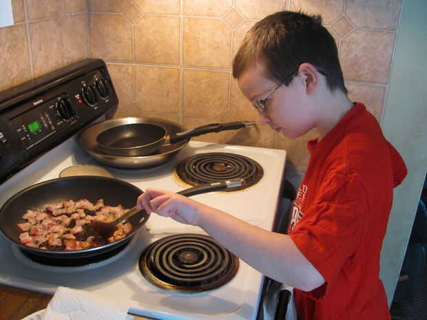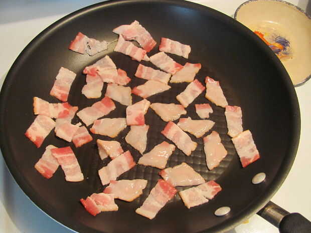 Mientras están hirviendo las patatas, prepárense su tocino. En primer lugar, comenzar a calentar un sartén a fuego medio. Luego, cortar el tocino en pequeños cuadrados * y ponerlos en la sartén. Cocine hasta que la textura deseada (dicen en los comentarios si te gusta crujiente o masticable)