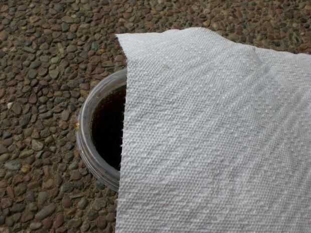 Cubrir el recipiente de tupperware con una toalla de papel. Deje un margen en el borde del recipiente para que unos mentos podría deslizarse fácilmente a través. (ver imagen)