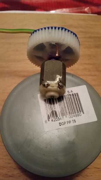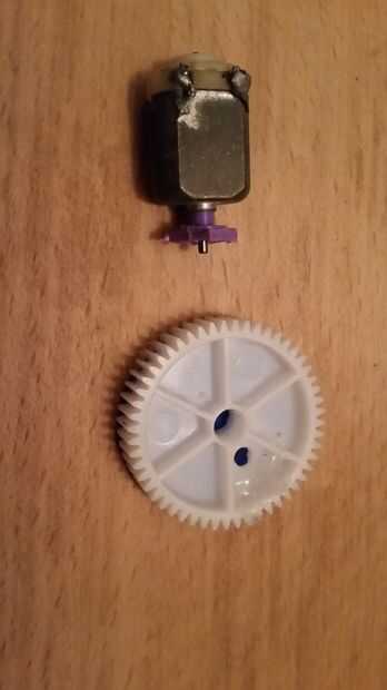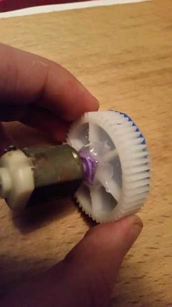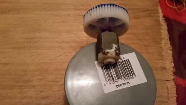 Pegue el engranaje al eje del motor y el motor en la tapa del pvc del pegamento, pegamento a la tapa de pvc de una pieza de madera.