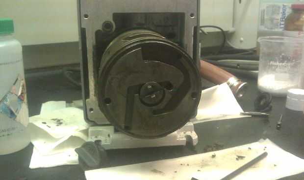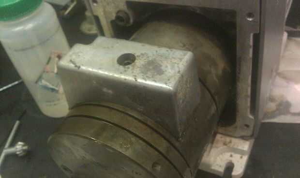 La tapa debe salir y se enfrentarán con la bomba de aceite como se muestra en la figura 4. Cuadro 5 muestra un primer plano de este. Se puede ver es una bomba de paleta rotatoria pequeña, con una paleta única sólida en el centro.