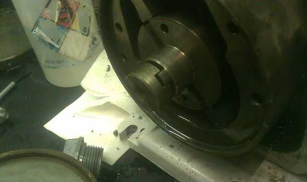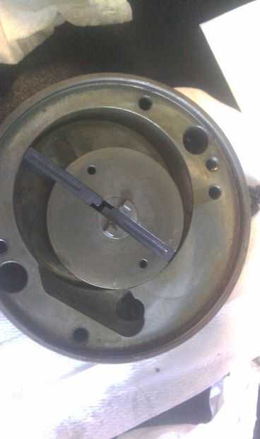 Usted notará que hay dos tornillos en la pared, estos tienen la segunda etapa en la primera etapa. Retirarlos y levante la segunda etapa, al igual que las otras dos juntas. Tenga en cuenta que hay un adaptador cilíndrico pequeño con arboledas en él que transfiere movimiento de paletas rotativas en la etapa 1 que en la etapa 2. Dependiendo de donde quiere pegar, o puede pegar la paleta rotatoria en la etapa 1 o la parte posterior de la paleta rotatoria en etapa 2. No perder esta pieza, así que asegúrese de que ubicarlo antes anterior. Nosotros ahora hemos expuesto todo lo que necesitábamos para limpiar la bomba.