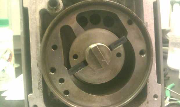 Te darás cuenta que esta sección consiste en una cavidad con una pieza de metal circular en el centro con dos pedazos de plástico gris, yo llamo a esto la Asamblea ovimiento. Las piezas de plástico son las paletas. Son muy plástico suave, ser muy cuidadoso con ellos. También son a menudo lo que pega cuando la bomba obtiene agarrada (estos o los de la primera etapa que veremos más adelante). Como dije antes, agarrar puede ser causado por dos modos diferentes. La primera es que la superficie en el exterior desarrolla una capa de mugre que impide que estas paletas deslizantes a lo largo de la orilla y consiguen pegados en lugar. La segunda es que una capa de mugre se desarrolla entre las paletas y el canal en el pedazo circular de centro. Estas piezas tienen muy estrechas tolerancias y una mugre acumulación allí impide las paletas, pegándolas en su lugar, para que cuando golpeó la pared y se supone que el contrato en el que no. Esto puede causar realmente paletas a romper, que requieren un kit de la reconstrucción.