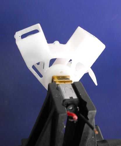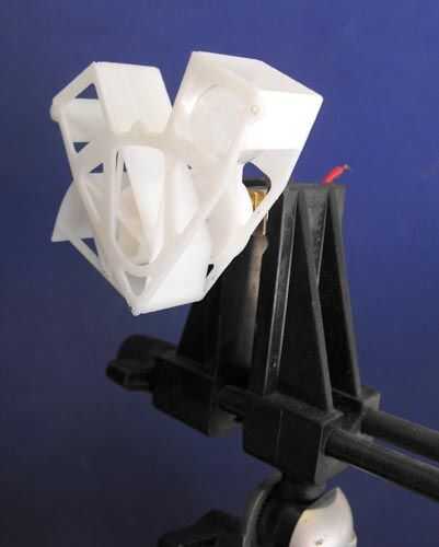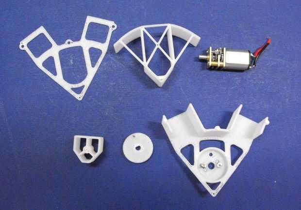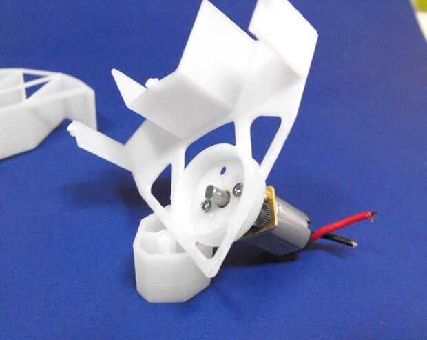 El modelo fue diseñado con Autodesk FREE software 123D e impreso de plástico ABS en una impresora up3D. Las piezas snap a presión ajuste nubs, y pedacitos de clip actúan como pivotes en las partes móviles. Un pequeño motor de engranaje montado en la parte posterior del dispositivo hace el giro.
