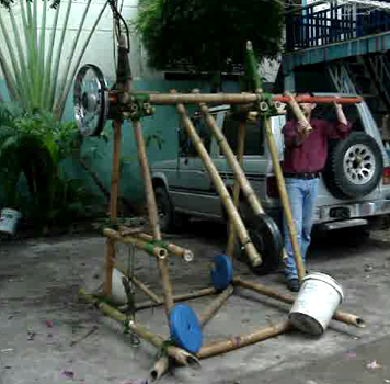 Permítanme desarrollar dos barras de pivot swing - uno usando la caña de bambú y uno con una longitud de tubería de acero del andamio. El bambú de bastante fuerte para el trabajo, pero es un material natural y no creo que es bastante controlable en su movimiento para mí para acoplamiento con la impulsión de cadena. Tubo de andamio me daría un derecho de la barra y me permite apoyar (y posiblemente conducir) la bomba en ambos extremos, que completaría el fortalecimiento de esta parte del sistema.