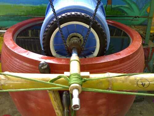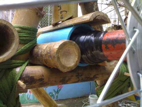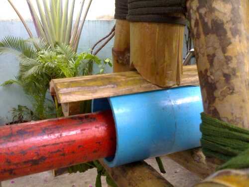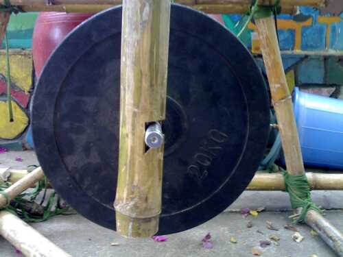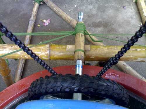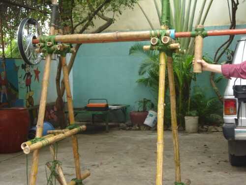 Este aumento incremental del diámetro del árbol por mangas hace apropiado en la barra de pivote de bambú grande mucho más fácil. Próximo - para soltar el eje de la rueda ampliada en la barra de pivote y 2 perforaciones a 90 grados a través de todas las capas, empuje los pernos a través de proporcionar la clave de la llave y las mangas, y después llenar cualquier espacio vacío restante en la caña del extremo del brazo de pivote con cemento.