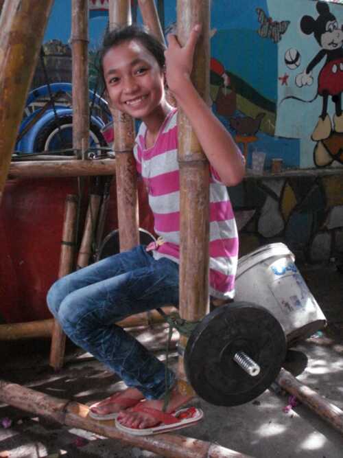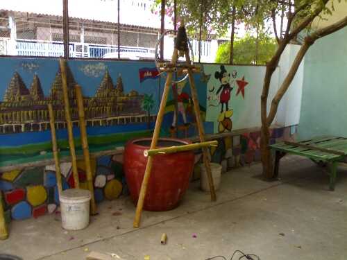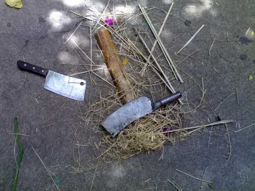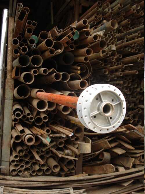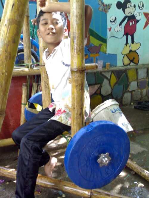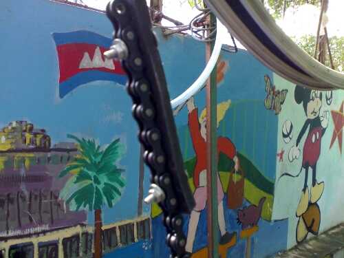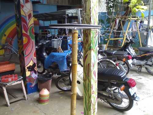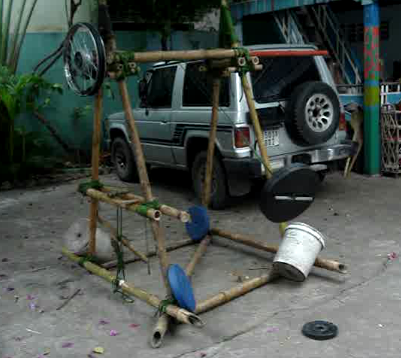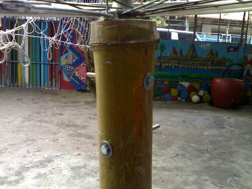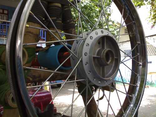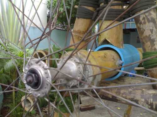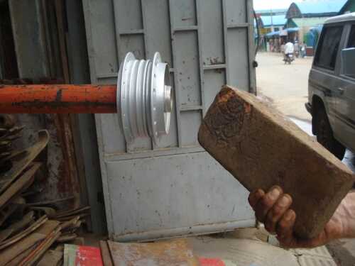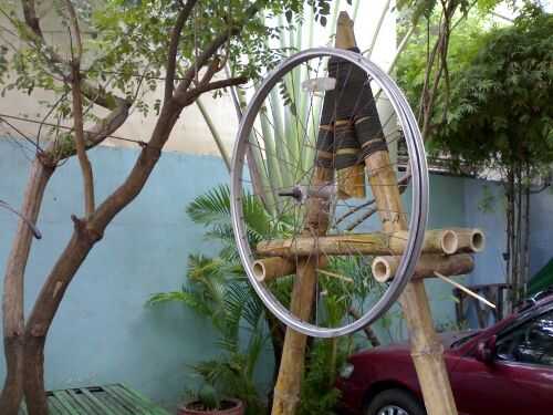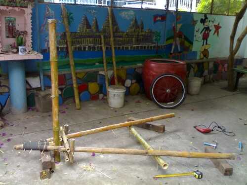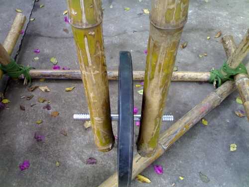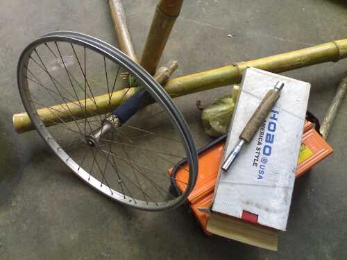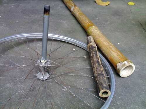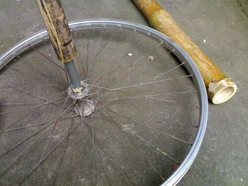 Encontró un viejo poste de andamio en Toul Sanke, el eje de rueda delantera de moto más barato, 19" llanta y radios en Toul Tumpong - persuadió el centro del polo del andamio y lo ata para arriba la rueda de esta tarde.