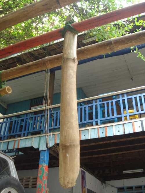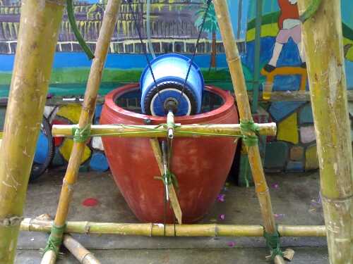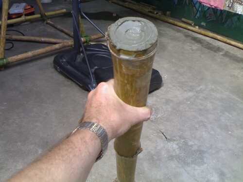 Llena la última caña del "otro extremo" de la barra de pivote con el cemento. Esta es la sección de bambú que el columpio se va convirtiendo en, y es un gran vacío a llenar - 1kg de cemento ($0,25) y alrededor de 1/2 litro de agua.