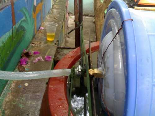 Ahora que la bomba es estable en el agua, puedo añadir más agua al cañón, que pone más de la bomba bajo el agua - que le permitió mover un mayor volumen de agua que ayer. De la bomba todavía alrededor del 20% demasiado alto, así que salida no lo que ha sido al girar la bomba en el barril con la mano.